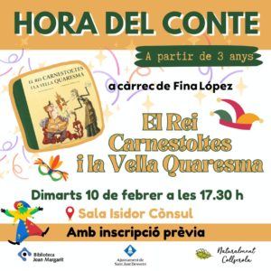 Dimarts 10 de febrer a les 17.30 h. Lloc: Sala Isidor Cònsul. Hora del conte: El Rei Carnestoltes i la Vella Quaresma, amb Fina López.