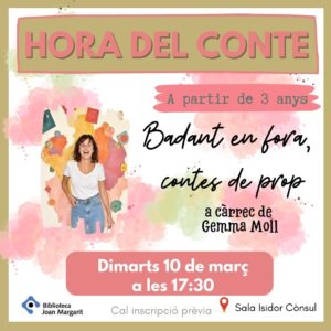 Dimarts 10 de març a les 17.30 h. Lloc: Sala Isidor Cònsul. Hora del conte: Badant enfora, contes a prop a càrrec de Gemma Moll.