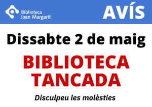 Dimecres 8 d’abril a les 18.30 h. Lloc: Les Escoles. Club de lectura del 1r dimecres. CANVI DE DATA! Dimarts 28 d’abril a les 18.30 h.