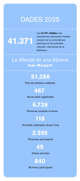 Actualment, la biblioteca compta amb 6.739 persones usuàries inscrites, de les quals 467 s’han donat d’alta durant el 2025. Paral·lelament, ha mantingut una programació cultural estable i diversa, amb un total de 118 activitats que han aplegat 2.395 participants, amb un pes destacat dels clubs de lectura i de les activitats adreçades al públic infantil i familiar.