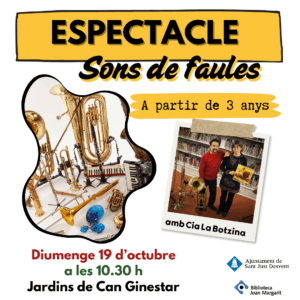 Diumenge 19 d’octubre de 2025 a les 10.30 h. Lloc: Jardins de Can Ginestar. Espectacle “Sons de Faules” amb Cia La Botzina. Amb motiu de les Festes de Tardor la biblioteca fa jornada de portes obertes i ofereix una sessió d’espectacle infantil per a tota la família. Concert on es combina la narració d’una conta-contes i el concert d’un músic. Tres faules ens mostraran aquest tipus de relats i el so dels instruments ens ajudaran a captar la màgia de les històries. Faules conegudes per tothom, però que es presenten musicalitzades. Com sonarà el lleó?, i el ratolí? A càrrec de Cia La