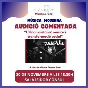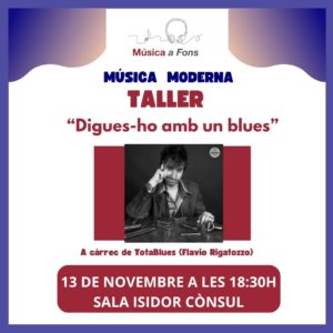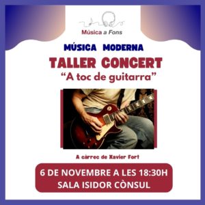 Dijous 6 de novembre a les 18.30 h. Lloc: Sala Isidor Cònsul. Taller-Concert “A toc de guitarra” a càrrec de Xavier Fort. Aquest taller és una proposta d’exploració pràctica, on amb la guitarra a les mans, analitzarem el paper d’aquest instrument en l’evolució de la música popular del segle XX. A través de l’audició en directe, viatjarem cronològicament pels estils més influenciats per la guitarra… Blues, country, rhythm blues, rock and roll, rock i hard-rock. Aquelles persones que ho desitgin poden assistir al taller amb la seva guitarra acústica… Cal deixar clar que aquesta és una qüestió personal i que
