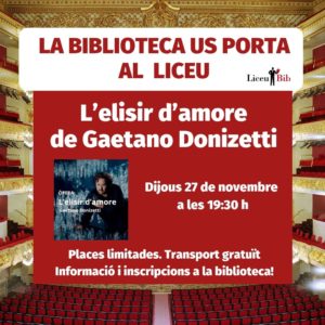 Dijous 27 de novembre a les 19.30 h. Sortida al Liceu: L’elisir d’amore de Gaetano Donizetti. La Biblioteca Joan Margarit us porta al Gran Teatre del Liceu a veure l’òpera L’elisir d’amore de Gaetano Donizetti, on el valor i l’èpica envolten la creació d’aquesta obra mestra del gènere buffo. Serà el dijous 27 de novembre dins el projecte LiceuBib, impulsat per la Generalitat de Catalunya i el Gran Teatre del Liceu. Totes les localitats del LiceuBib s’ofereixen amb unes condicions especials, butaques a zona 3 (pisos centrals, 2n i 3r, i als laterals de platea), amb un preu de 100€ (PVP 157€).