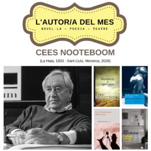 Durant el mes d’abril Autor del mes: Cees Nooteboom (La Haia, 1933 – Sant Lluís, Menorca, 2026). Un dels grans escriptors neerlandesos i un dels més interessants de la literatura contemporània. Europeista i gran viatger, va escriure no poques cròniques de viatges i d’estades, sempre amb la seva personal forma d’observar i narrar, com les dedicades a Venècia, Berlín, Japó, Llatinoamèrica, Àfrica, Austràlia… o les de diferents indrets d’Espanya, especialment Menorca, on vivia bona part de l’any, on «s’aïllava del món» i on va morir. Perquè per a Cees Nooteboom, tan important va ser recórrer el món i delectar-se amb la gent, els paisatges, les arquitectures i les arts, com, recloure’s, reflexionar, llegir, escriure i gaudir de la solitud. Una dicotomia que, certament, viu i aflora a la seva polièdrica producció literària que abasta vuit dècades d’escriptura. Habitual de les apostes al Nobel de Literatura, el 2020 va guanyar el
